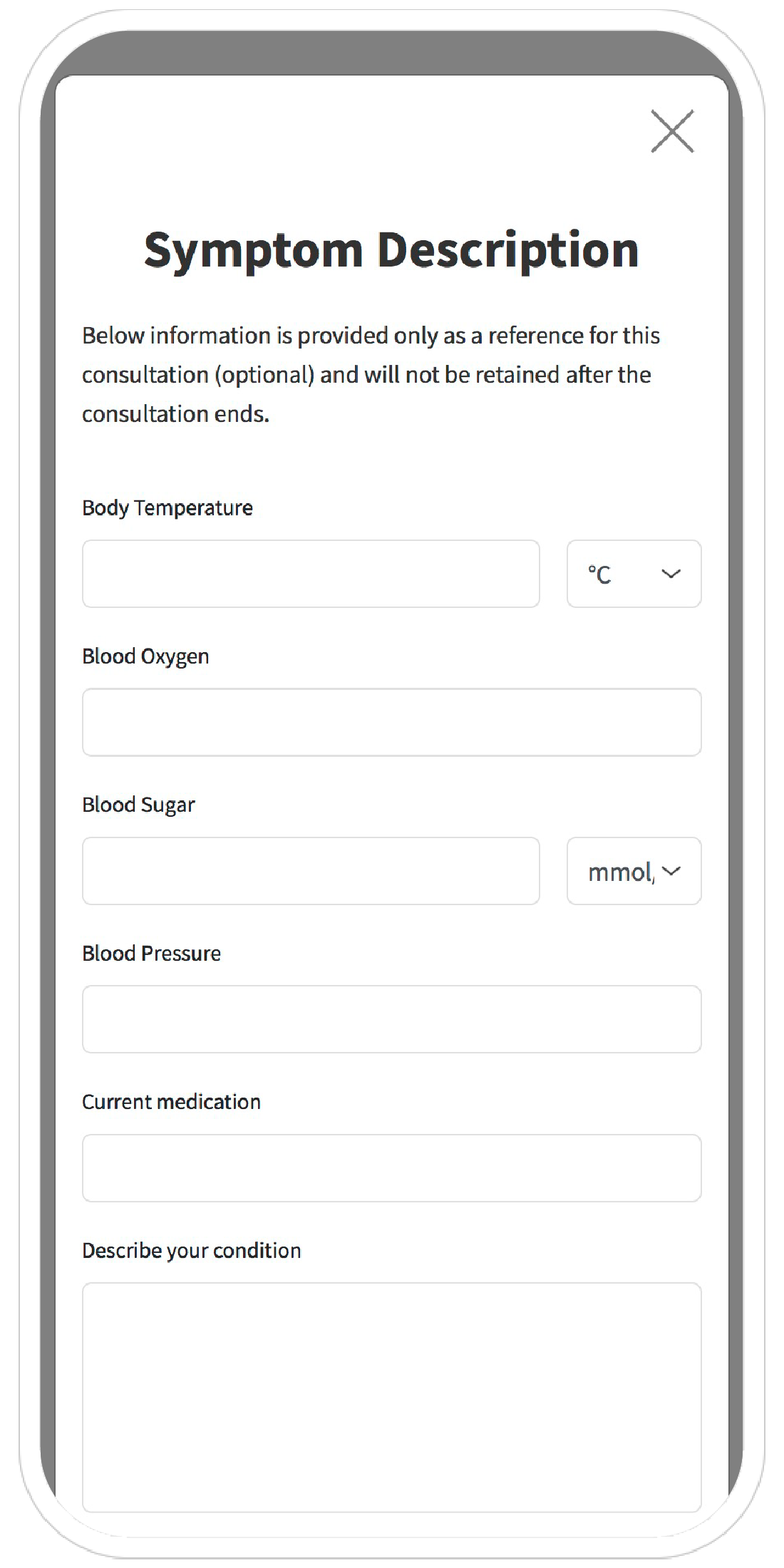 We recommend preparing your vital signs such as temperature, blood pressure, and blood oxygen levels for the doctor's reference. Before entering the consultation room, the system will prompt you to fill out this information.